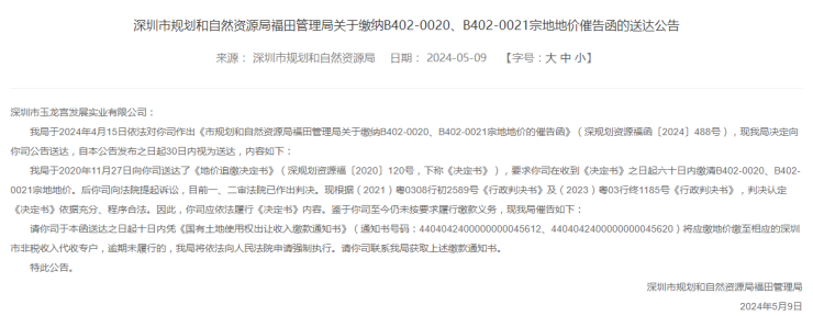 近日,深圳市规划和自然资源局福田管理局发布关于缴纳B402-0020、B402-0021宗地地价催告函的送达公告。
