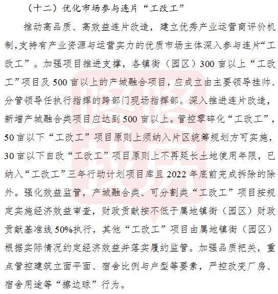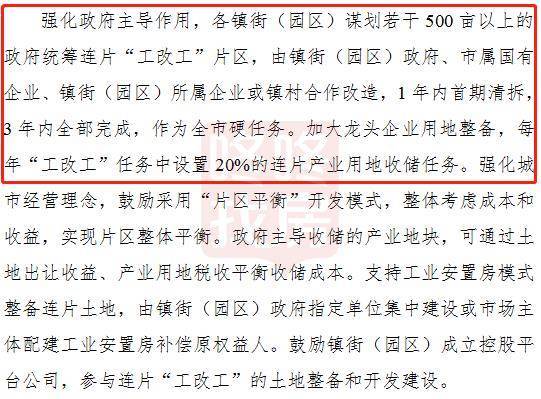 ● 各镇街(园区)谋划若干500亩以上的政府统筹连片“工改工”片区,1年内首期清拆,3年内全部完成,作为全市硬任务。