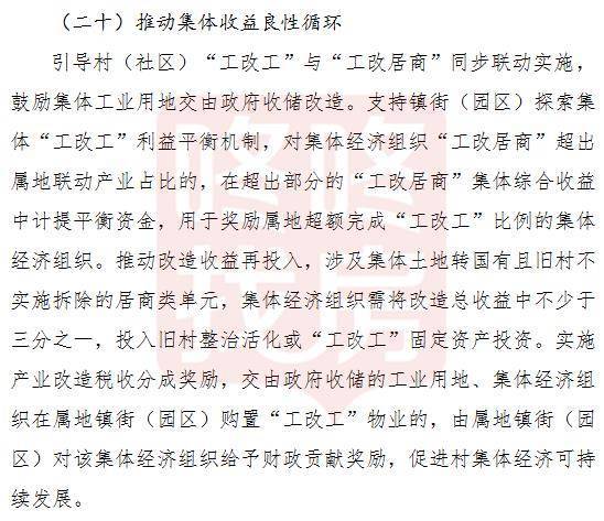 支持镇街(园区)探索集体“工改工”利益平衡机制,对集体经济组织“工改居商”超出属地联动产业占比的,在超出部分的“工改居商”集体综合收益中计提平衡资金,用于奖励属地超额完成“工改工”比例的集体经济组织。