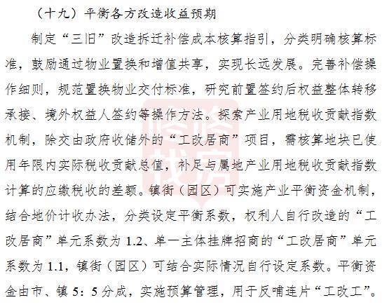 镇街(园区)可实施产业平衡资金机制,结合地价计收办法,分类设定平衡系数,权利人自行改造的“工改居商”单元系数为1.2、单一主体挂牌招商的“工改居商”单元系数为1.1,镇街(园区)可结合实际情况自行设定系数。平衡资金由市、镇5:5分成,实施预算管理,用于反哺连片“工改工”。