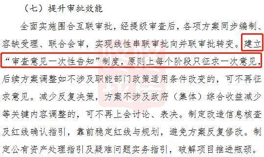● 建立“审查意见一次性告知”制度,原则上每个阶段只征求一次意见,后续方案调整如不涉及职能部门政策适用条件改变的,可不再征求意见。减少反复决策,方案不涉及政府(集体)综合收益减少等关键内容调整的,可不再上会讨论、表决。