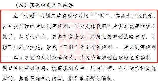 在“大圈”内划定重点改造片区“中圈”,实施大片区改造。以中观层面的片区统筹规划,作为支撑政府连片规划统筹的核心抓手,从更大广度、更高视角出发,承接上层规划战略意图,引领下层单元实施,形成“三旧”改造专项规划——片区统筹规划——单元规划的规划统筹体系。