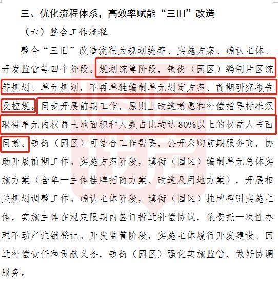 ● 规划统筹阶段,镇街(园区)编制片区统筹规划、单元规划,不再单独编制单元划定方案、前期研究报告及控规。同步开展前期工作,原则上改造意愿和补偿指导标准须取得单元内权益土地面积和人数占比均达80%以上的权益人书面同意。
