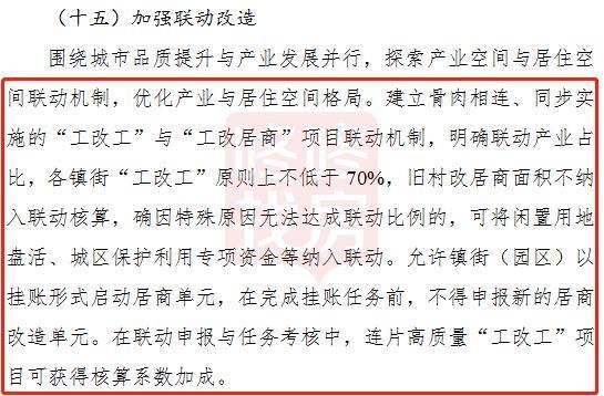 建立骨肉相连、同步实施的“工改工”与“工改居商”项目联动机制,明确联动产业占比,各镇街“工改工”原则上不低于70%,旧村改居商面积不纳入联动核算,确因特殊原因无法达成联动比例的,可将闲置用地盘活、城区保护利用专项资金等纳入联动。