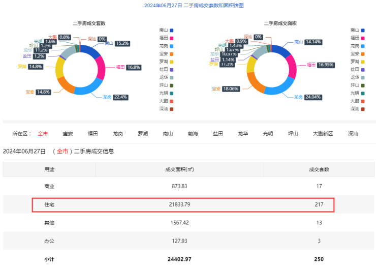 2024年6月27日二手房住宅网签217套。宝安29套;福田37套;龙岗51套;罗湖30套;南山34套;盐田3套;龙华25套;光明3套;坪山3套;大鹏2套。