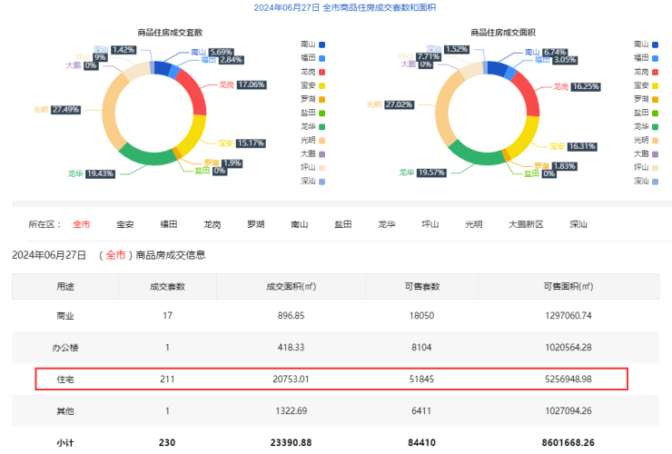 2024年6月27日新房住宅共网签211套。宝安32套;福田6套;龙岗36套;罗湖4套;南山12套;盐田41套;龙华41套;坪山19套;光明58套;大鹏0套;深汕3套。2024年6月27日二手房住宅网签217…