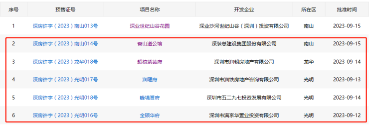 据深圳房地产信息平台公示,截至发稿前,本周已有5个住宅新盘取证,其中光明连续三天连发3张预售许可证,共批预售房源1688套;龙华北站也上新,单盘推出464套房源;而南山的香山道公馆,则是尾盘加推,共备案5套房源。