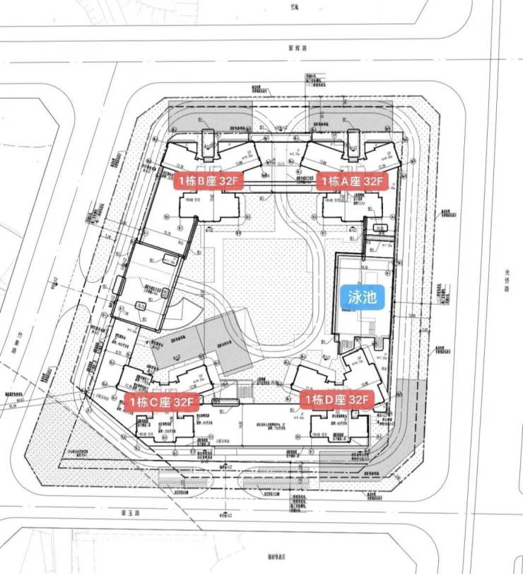 项目规划由4座高层建筑组成,四个角落各坐落一栋,其中1A座、1B座、1C座是32层高的住宅楼、1D座是30层高的住宅楼,四座建筑底部设置有1层裙楼商业。