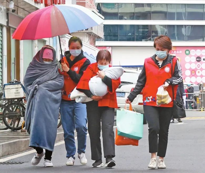 ▲两名志愿者帮助一位刚生产完的居民回到住处(杨浩翰 摄)
