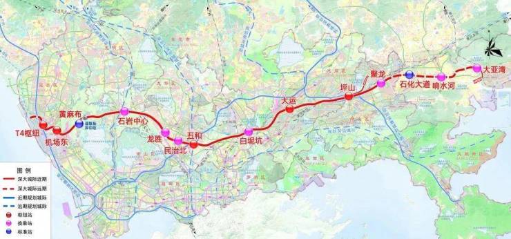 全线设地下站 11 座,分别为:T4枢纽、机场东、黄麻布、石岩中心、龙胜、民治北、五和、白坭坑、大运、坪山、聚龙。