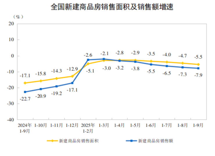 国家统计局数据显示,1—9月份,全国房地产开发投资67706亿元,同比下降13.9%(按可比口径计算,详见附注6);其中,住宅投资52046亿元,下降12.9%。