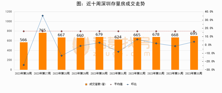 存量房方面,第35周深圳存量房成交695套,较上周增加27套,环比上涨4%。从近十周成交走势来看,周均成交套数为666套,本周高于平均水平4.4%。