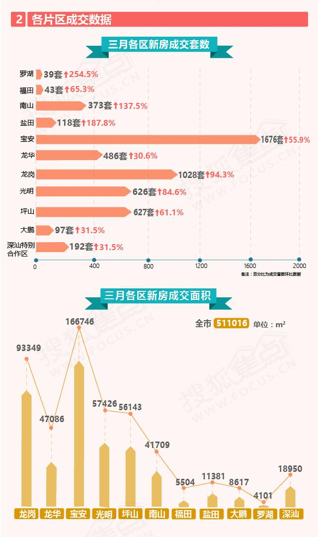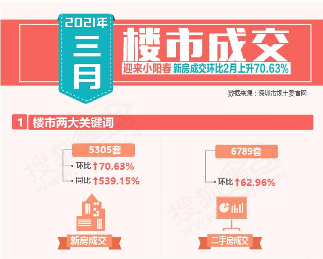 据搜狐焦点统计,2021年3月深圳新房成交5305套,环比2021年2月上涨70.63%,同比2020年2月上涨539.15%;二手房成交6789套,环比2021年2月上涨62.96%。