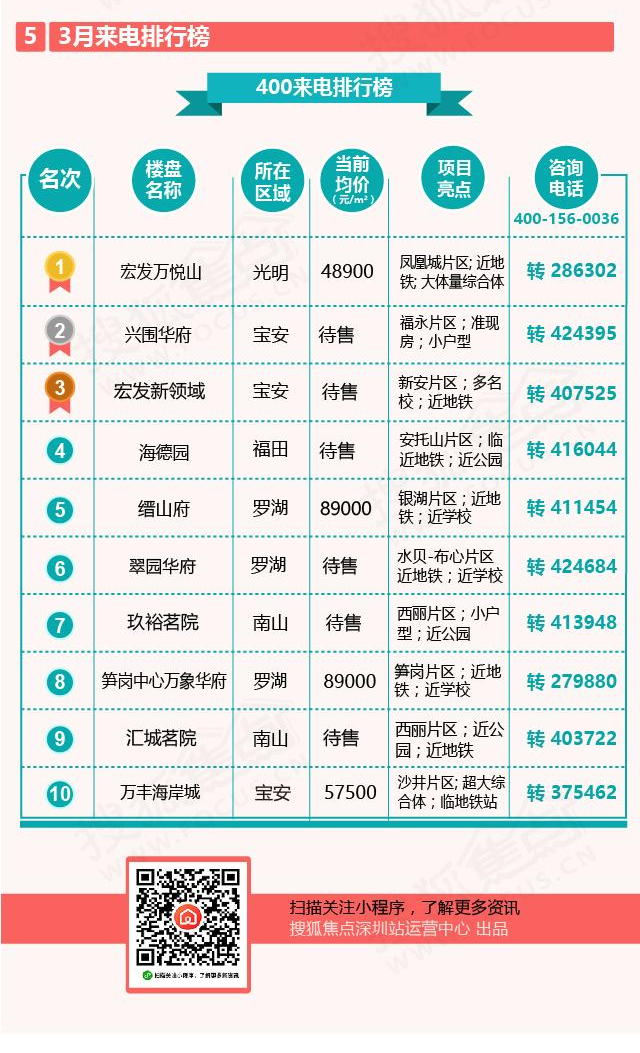 本月的400咨询热盘前三依旧被西部片区宝安和光明的热盘包揽,3月新开盘的光明凤凰城片区的宏发万悦山稳坐排名前列;宝安的兴围华府和宏发新领域位列第二和第三位。根据400来电排行榜可见,南山西丽片区的两个待售新盘很有可能成为接下来较为有关注度的新盘。在众多西部热盘中,月初入市的罗湖新盘缙山府和笋岗中心万象华府突出重围,在前十榜单中占了两席,而本次仅有大户型入市的万丰海岸城依然拥有很高的关注度的。
