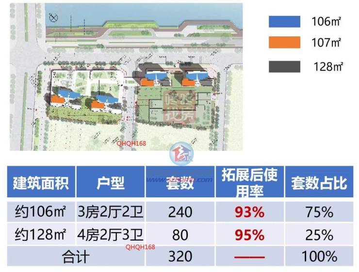 三期户型以106-128㎡的3-4房为主,其中,106-107m²3房2卫,240套;128m²4房2卫,80套。