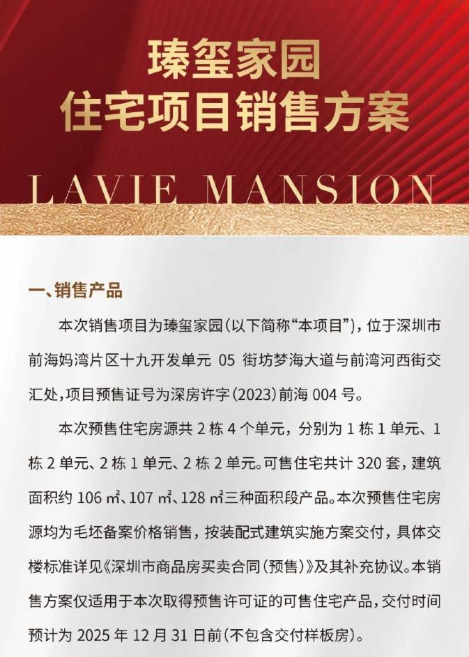 根据销售公告显示:本次预售住宅房源位于1栋1/2单元,2栋1/2单元,可售住宅320套,建面面积约106/107/128㎡三种面积段,本次预售住宅均为毛坯备案,按装配式建筑实施方案交付,预计2025年12月31日交房。