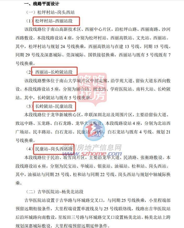 27 号线一期工程联系西丽高铁新城、西丽湖国际科教城、深圳北站商务中心 及坂雪岗科技城。线路走向为:松坪山路——西丽南路——沙河西路——学苑大道 ——留仙大道——致远中路——玉龙路——白石龙路——龙华大道——民清路— —张衡路——环城路。