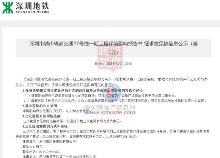 深圳地铁27号线一期工程环境影响报告书 征求意见稿(第二次)信息公示。