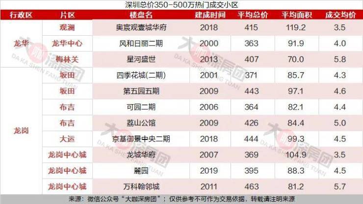筛选的楼盘中,单价最低的是龙岗中心城片区的龙城华府,目前该小区成交均价为3.5万元/㎡,平均面积也达到了104.9平米,均总价369万元。