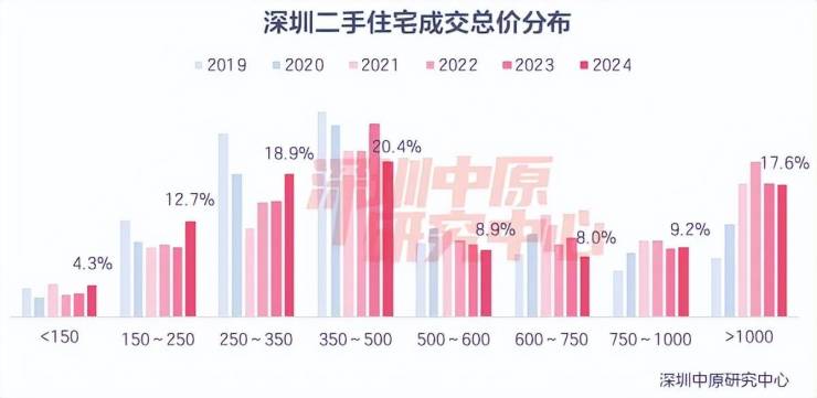 根据深圳中原研究中心年报数据显示,2024年深圳成交各价格段中,350万-500万价段是成交主力,成交套数占比为20.4%。
