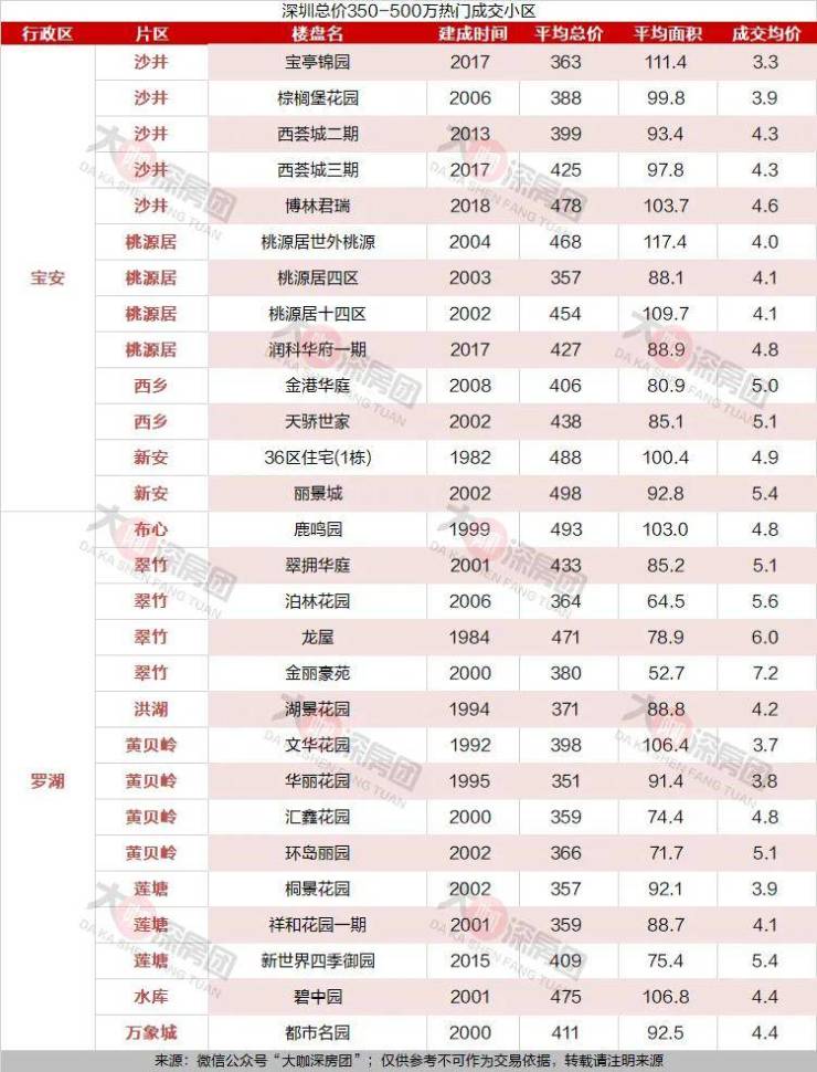 成交均价最低的是沙井的宝亭锦园,成交均价为3.3万元/㎡。