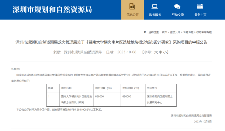 2023年10月,深圳市规划和自然资源局官网发布了《暨南大学横岗南片区选址地块概念城市设计研究》采购项目的中标公告。