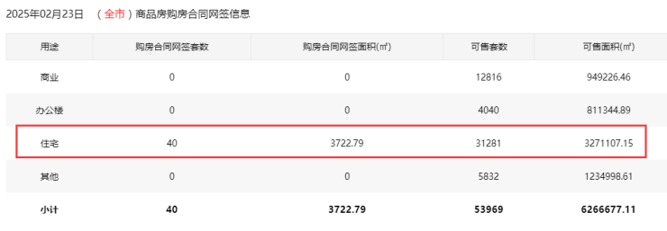 2025年2月23日新房购房合同网签40套。其中,宝安9套;福田1套;龙岗19套;罗湖0套;南山0套;盐田0套;龙华1套;坪山0套;光明10套;大鹏0套;深汕0套。