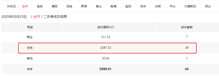 2025年2月23日二手房住宅网签34套。其中,宝安2套;福田5套;龙岗9套;罗湖4套;南山7套;盐田13套;龙华4套;坪山3套;光明1套;大鹏0套。