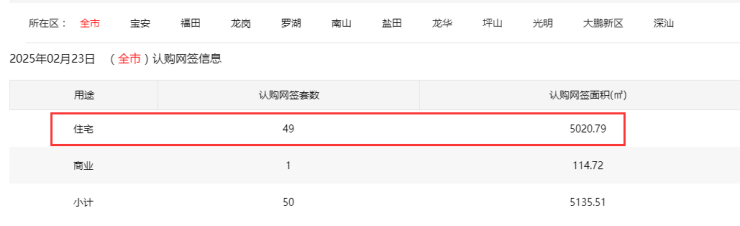 2025年2月23日新房住宅认购网签49套。其中,宝安16套;福田0套;龙岗10套;罗湖0套;南山0套;盐田0套;龙华12套;坪山3套;光明8套;大鹏0套;深汕0套。其中,宝安9套;福田1套;龙岗19套;罗湖…