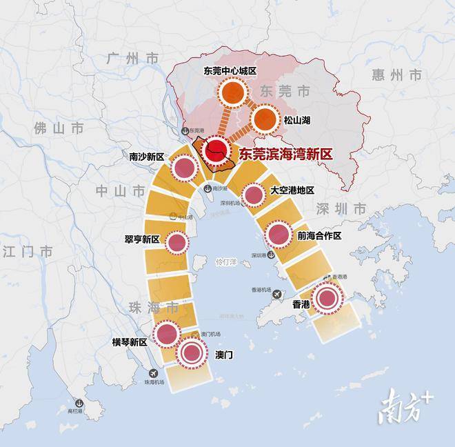 第一,滨海湾新区位于黄金内湾的中轴支点位置。作为国家级战略粤港澳大湾区的重点组成部分之一,处在珠三角黄金中轴位置的滨海湾新区将是东莞,乃至整个大湾区的重点位置,承上启下。东莞对此的重视自不必说,从近年一步步快速提高滨海湾的地位至持平松山湖也可见一斑。另外因为毗邻广州南沙、深圳大空港,二者也是黄金内湾中相当重要的区域,所以滨海湾新区能否成功,将极大的影响到深圳西部和广州南部区域,可谓“一荣俱荣、一损俱损”。在广东省内部,广深莞三城利益如此统一基本还是头一回。所以,站在粤港澳大湾区的层面,滨海湾新区的地位将高于松山湖。
