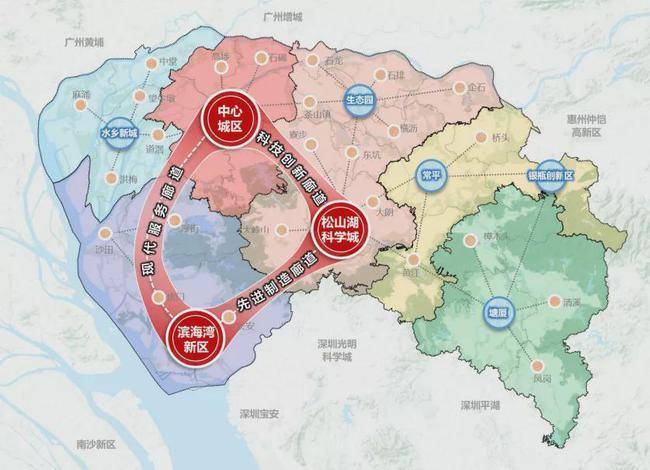 而这一次的片区规划设计,直接为后来东莞的产业建设埋下了有力的伏笔,首先脱颖而出的即是由松山湖高新科技园带领的松山湖片区,依靠引入了华为制造业总部基地以及华为上下游的庞大供应链相关企业,松山湖成为了全国知名的科技创新发展园区,并源源不断吸引更多的高科技企业,高端产业集聚逐渐成形。紧跟松山湖其后的是由滨海湾新区带领的滨海片区,依托黄金内湾口岸位置,毗邻深圳前海和大空港,滨海湾产新区业发展成绩有与松山湖一比之力,多家500强企业、行业龙头企业如vivo、oppo、欧菲光等落户新区。于是2019年,东莞提出了“中心城区、松山湖、滨海湾新区‘三位一体’”的发展格局,在2022公布的“十四五”发展规划中,提出“多中心、分片区、网络化”的城市布局方向,构建“中心引领、廊道支撑、片区协同、节点开花”的城市空间格局,实施中心城区、松山湖、滨海湾新区“三位一体”的都市强心战略,继续规划打造“三中心”。