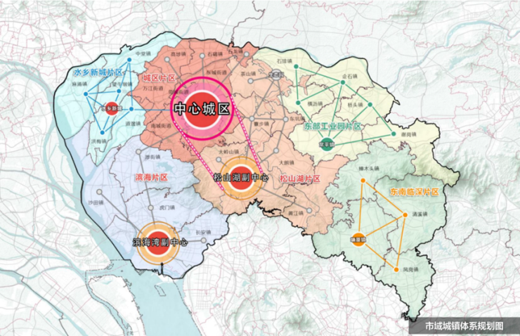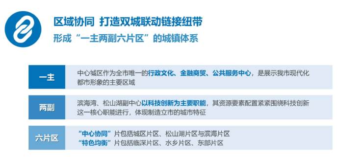 此次提出的“一主两副“发展规划,是对原“三位一体“战略的重大调整。“一主”是指中心城区做为全市唯一的行政文化、商贸金融、公共服务中心,是展示现代化都市形象的主要区域。“两副”是指松山湖和滨海湾两个副中心,以科技创新做为主要职能,其资源要素紧紧围绕科创新这一核心职能进行,体现制造立市的城市特征。这次调整提升了城区片区的行政地位,而滨海湾和松山湖看似地位不如之前的三位一体,实际却不然,这是把科技创新和产业发展与行政中心剥离,更加强化了滨海湾和松山湖的产业发展中心的地位。
