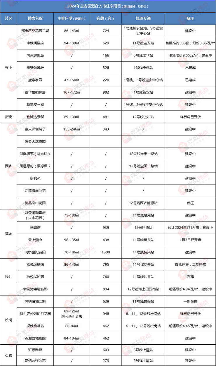 据搜狐焦点不完全统计,2024年宝安预计有28个住宅新盘项目,超1.2万套房源计划推出。