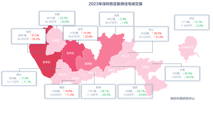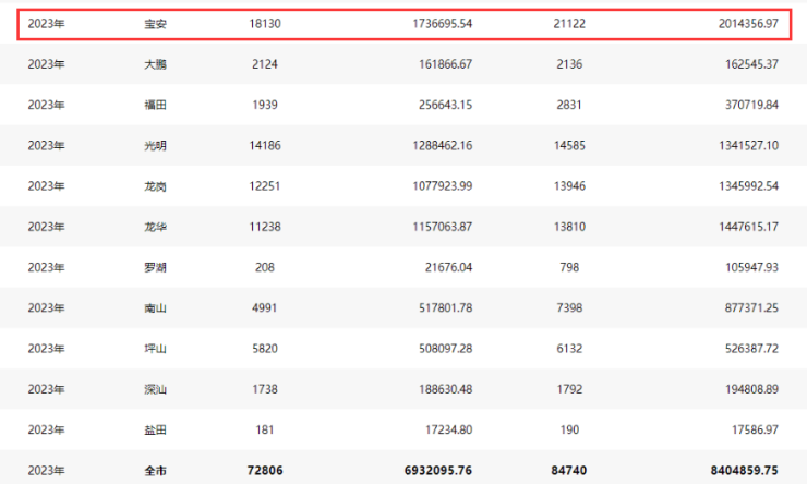 成交方面,宝安也遥遥领先。据深圳中原研究中心统计,2023年宝安共成交8891套新房住宅,同比涨幅近4成,成交量远超龙华、龙岗等供应大区。