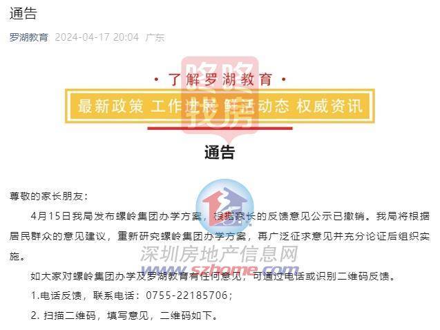 4月17日晚间,@罗湖区教育局官方公众号发布通告,回应近期“螺岭初中学区划分问题”,表示根据家长的反馈意见公示已撤销。