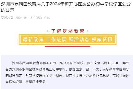 4月15日,@罗湖教育发布关于2024年新开班区属办公初中学校学区,新开班一所,为罗湖区螺岭教育集团初中学校。