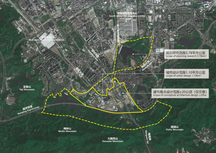 规划研究范围:东至银湖山,西至玉龙路,南至梅林山、银湖山,北至民乐路,总面积为3.78平方公里,并考虑与深圳北站、华南国际物流中心、民乐村、梅林山、银湖山、民治水库等周边片区的统筹协调关系。