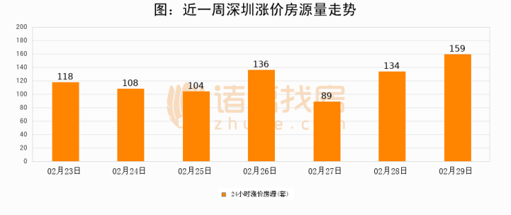 根据诸葛找房数据显示,深圳24小时涨价房源量为159套,较02月28日增加25套,环比上涨18.7%。与此同时,涨价房源占比小幅扩大,业主信心有所提升。