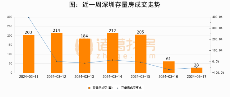 从存量房来看,2024年03月17日深圳存量房单日成交28套,比昨日减少33套,环比下降54.1%。从近一周存量房成交来看,深圳存量房日均成交套数为158套,03月17日单日成交28套,低于近一周平均水平82.3%。