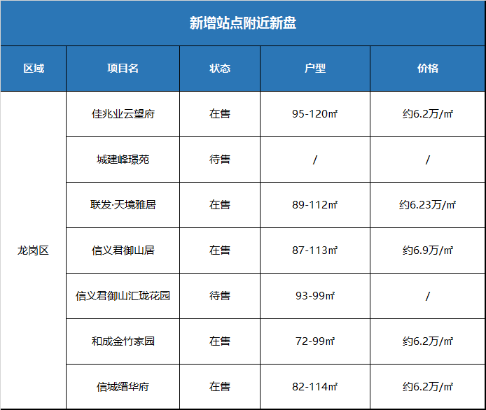 新增的地铁站点,主要受益坂雪岗片区及片区内的新盘。目前环城路沿线的新盘有7盘,大部分已经开盘入市,均价在6.2-6.9万/㎡之间。