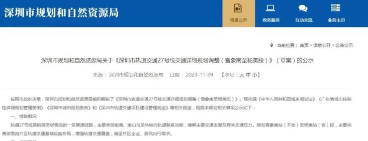 11月9日,深圳市规划和自然资源局发布了关于《深圳市轨道交通27号线交通详细规划调整(雪象南至杨美段)》(草案)。