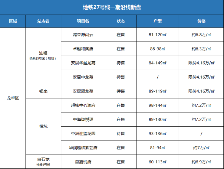 新盘价格方面来看,27号线龙华段的商品住宅价格基本是在6-7.2万/㎡左右,对刚需、改善置业人群相对友好;而人才房限价则在4.16万/㎡左右。