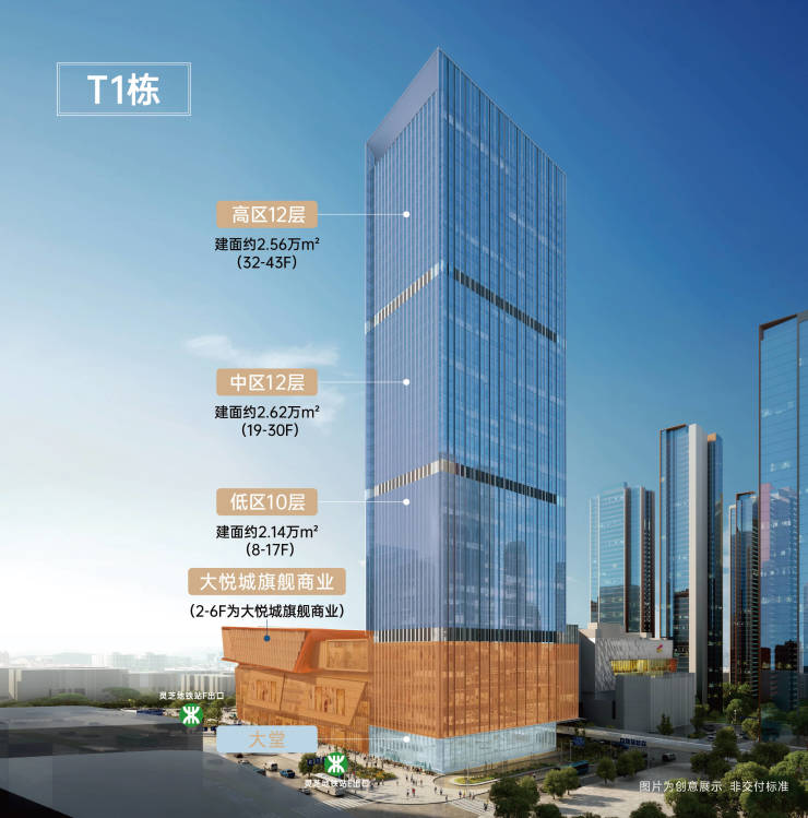 T1栋为大悦城旗舰商业上盖,合理分区,建面约90-25000㎡甲级商务空间全球租售