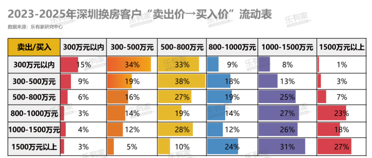 而占比52%的客户,在卖出总价在500-1000万元房源,直接进阶千万级资产,新购入1000-1500万元的房源。