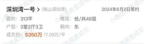 而去年6月成交的一套相似户型,面积313㎡的低楼层单位,则是17.09万/㎡。