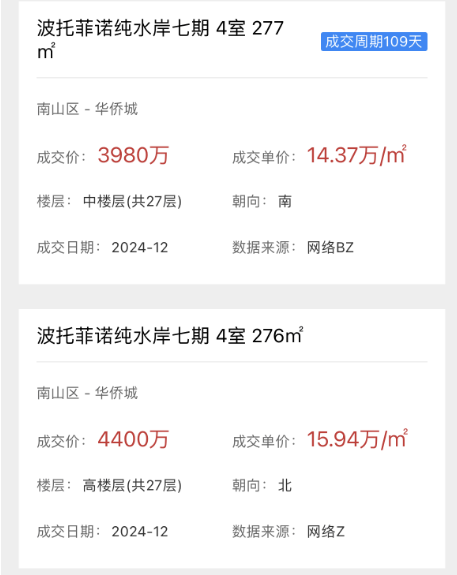 2024年12月,纯水岸7期分别成交一套276㎡、277㎡的别墅产品,277㎡的中楼层房源成交单价14.37万/㎡,276㎡的高楼层成交单价15.94万/㎡。