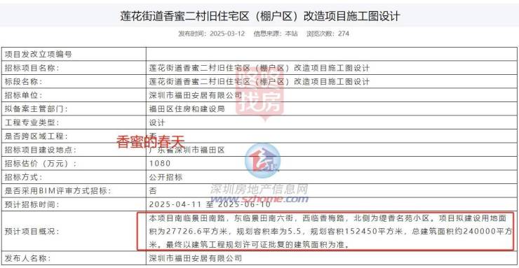 近日,香蜜二村棚改项目再次传来新消息,项目施工图设计招标,招标时间为2025年4月11日—6月10日,招标估价1080万元。