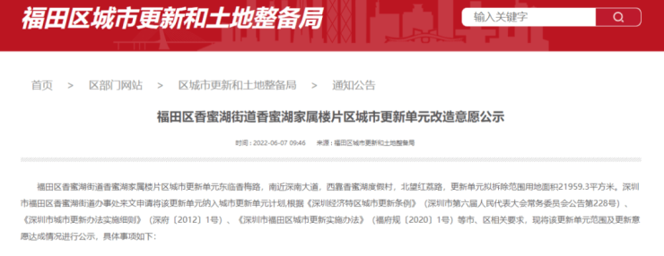 2022年5月7日,深圳市福田区人民政府发布了关于香蜜二村棚改项目的房屋征收决定书;同时,深圳市福田区香蜜二村棚改项目房屋征收补偿方案也进行公示。