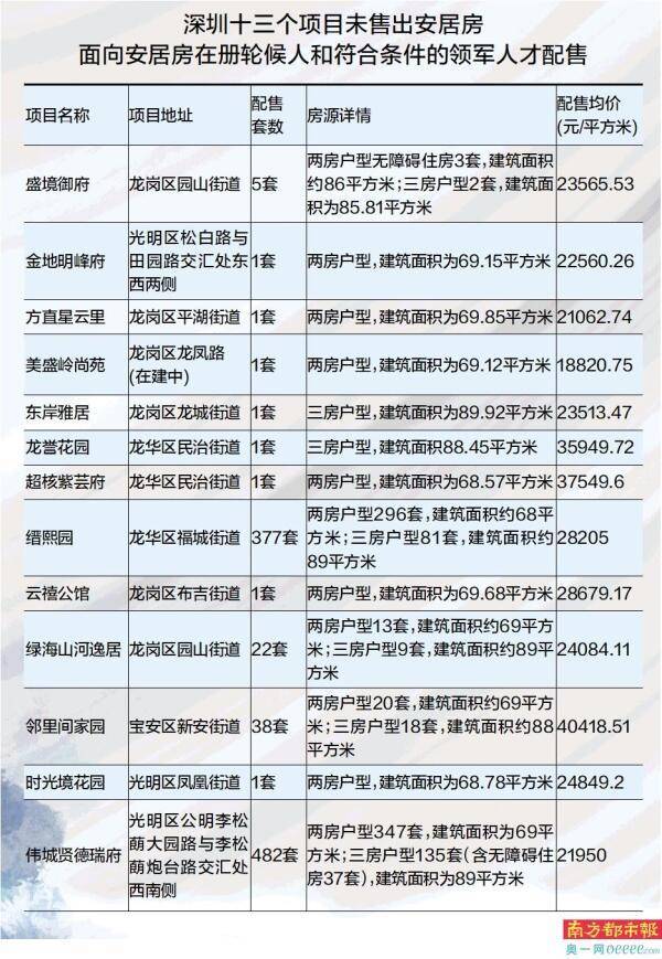 近日,记者从深圳市住房和建设局获悉,深圳十三个项目未售出安居房面向安居房在册轮候人和符合条件的领军人才配售。此次提供房源共932套,其中,两房685套(含无障碍住房3套),三房247套(含无障碍住房37套)。截至2024年9月23日,深圳安居房在册轮候家庭总数为187630户。