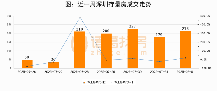 从存量房来看,2025年08月01日深圳存量房单日成交213套,比昨日增加34套,环比上涨19%。从近一周存量房成交来看,深圳存量房日均成交套数为159套,08月01日单日成交213套,高于近一周平均水平34%。